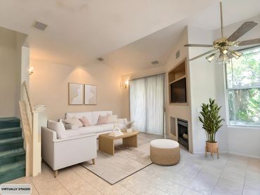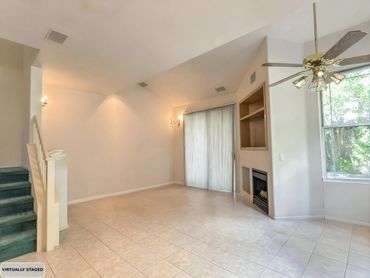 The kitchen and living room are bathed in natural light, thanks to large windows that frame the beautiful hillside view. The hillside, regularly maintained by the city, adds to the open, calming environment behind the home.