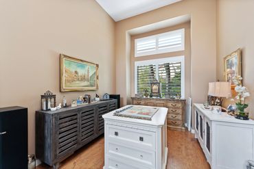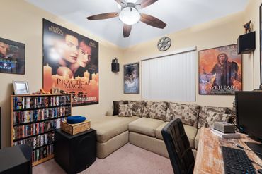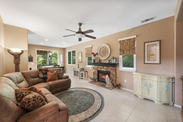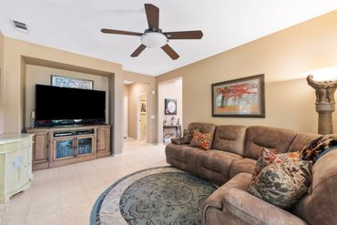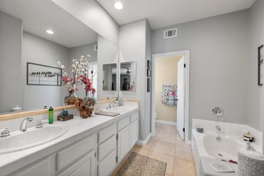 bedrooms with a hall bathroom displaying a shower over tub and dual sinks. Other highly desired features include plantation shutters and custom window treatments throughout, dual paned windows – some are oversized view windows and lighted ceiling fans.