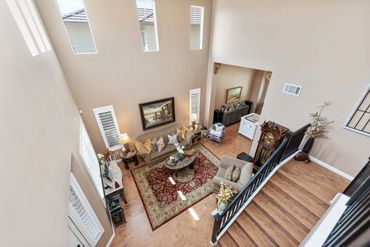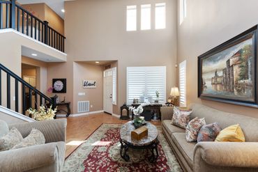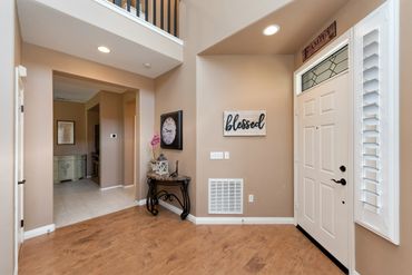 Features and upgrades include sweeping 2-story ceilings, designer wall colors, engineered hardwood flooring on the lower level, stairs and upper hall, a wrought iron staircase, a powder room with a pedestal sink, a downstairs laundry room adjacent to the direct access door to the spacious 3- car garage, formal living and dining rooms, a family room with a fireplace, a breakfast nook with a slider to the inviting zen-like backyard with lush foliage and a large solid covered patio.