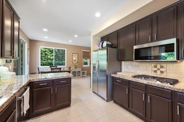 The lovely kitchen offers rich, dark wood cabinetry, granite countertops with a full tumbled travertine and glass tile backsplash, under-cabinet lighting, a single-bowl stainless sink and view window to the back, stainless appliances including a dishwasher, a 5-burner range, a microwave, and a double oven. The upper floor is thoughtfully designed with a large master suite with a large walk-in closet, dual sinks, an oval soaking tub and a shower. There are 3 generously-sized